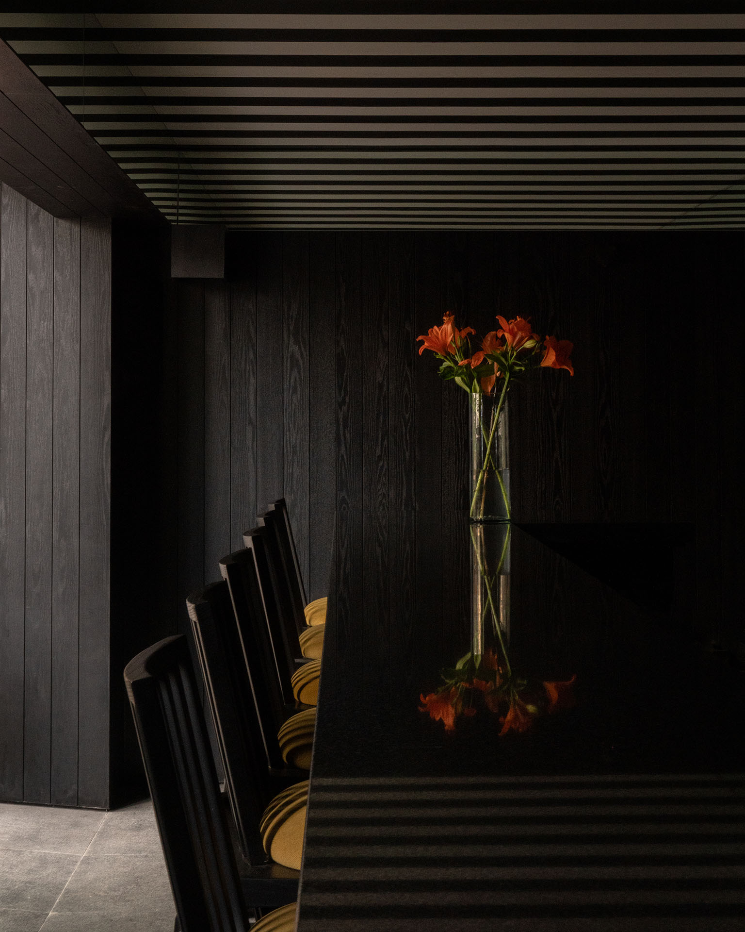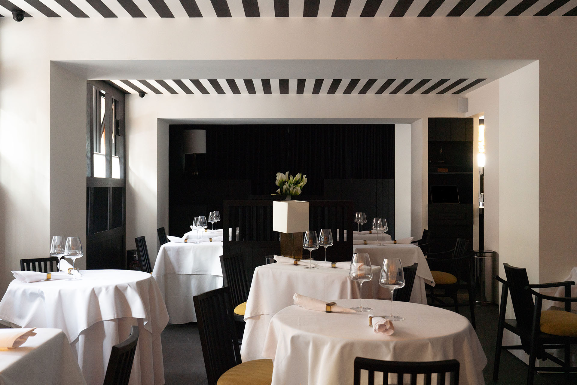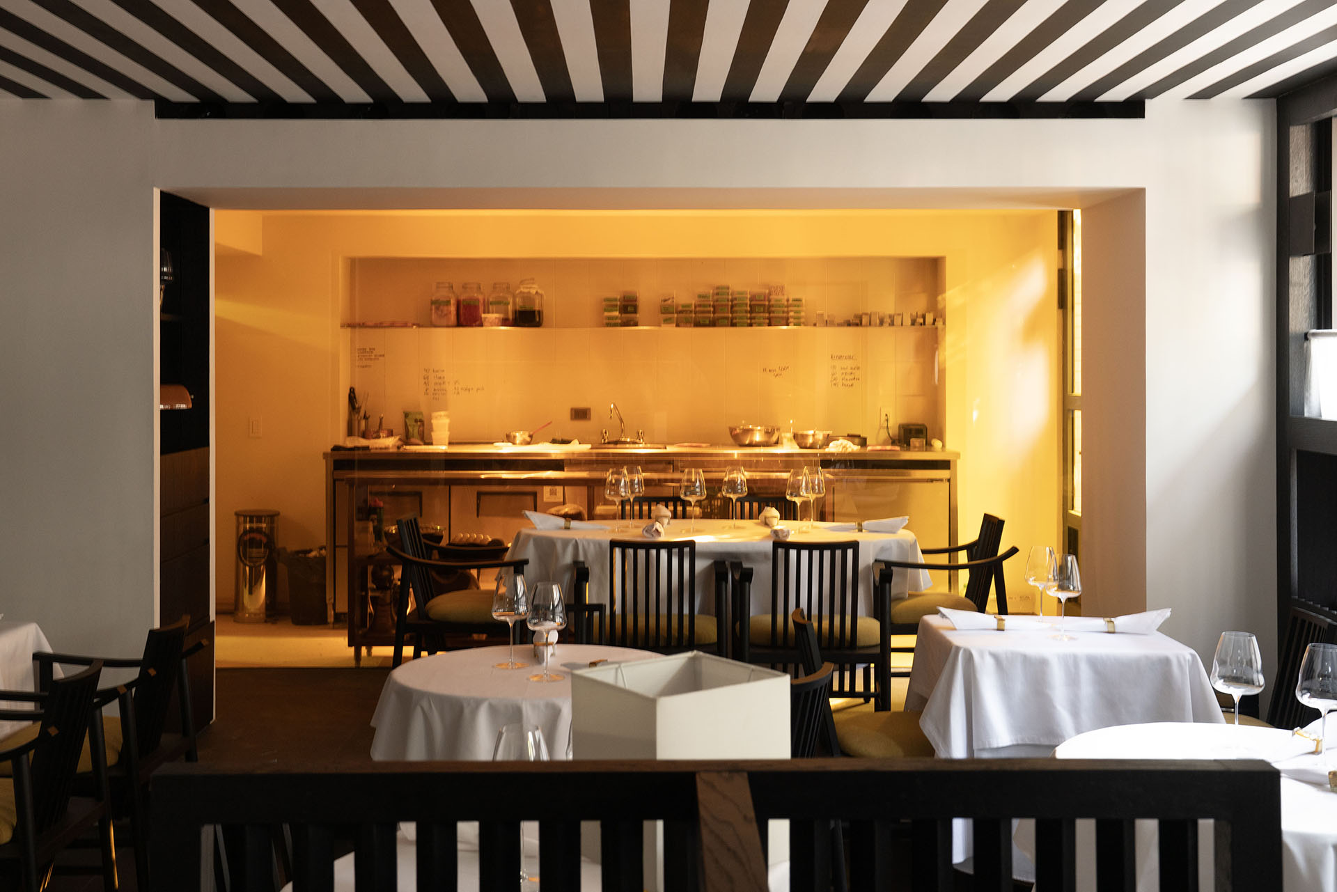 Los techos y muebles cuentan con elegantes líneas en blanco y negro, creando efectos distintivos de sombra y luz que contribuyen a la atmósfera sofisticada del restaurante, que envuelve y celebra tanto el sabor como el diseño.