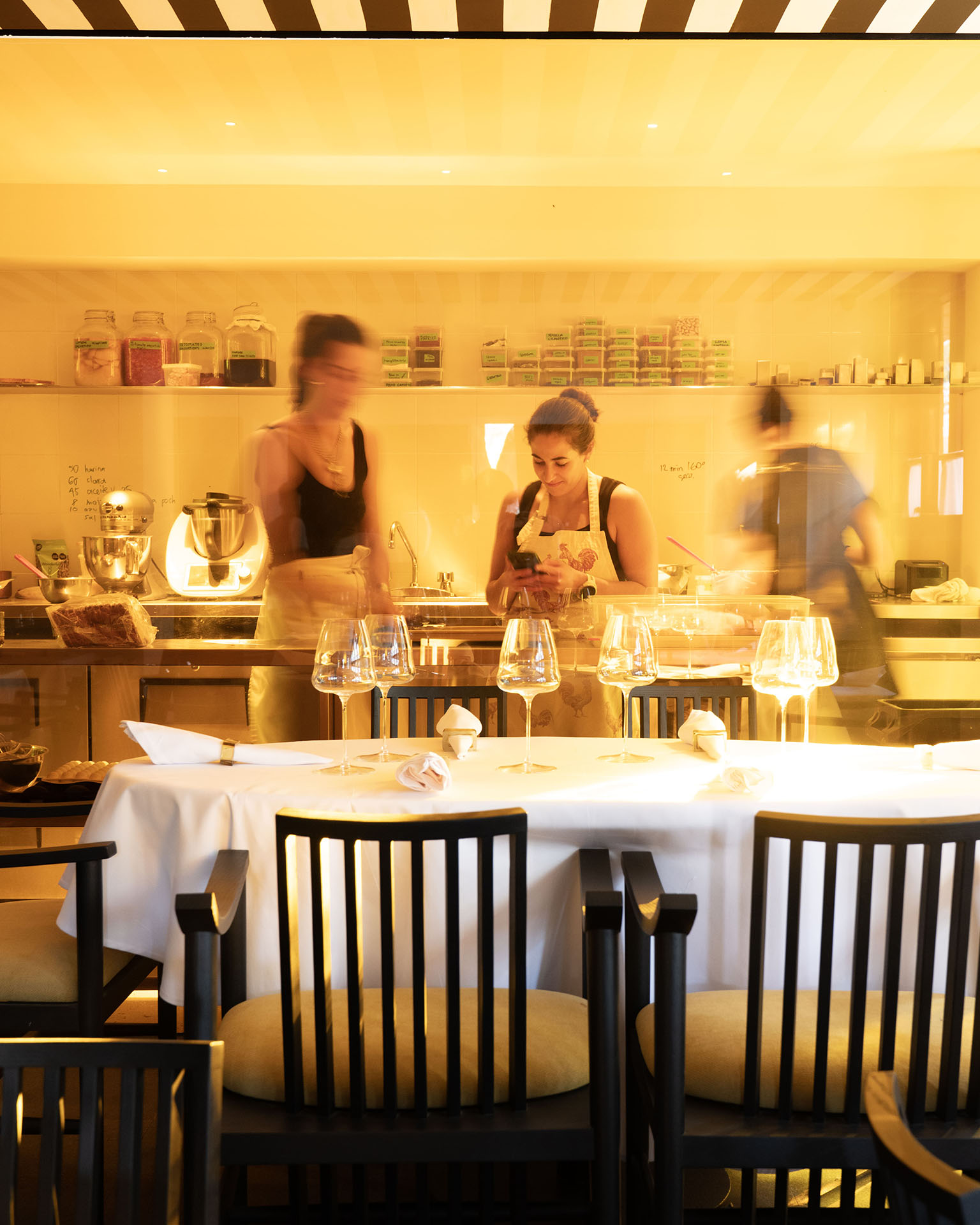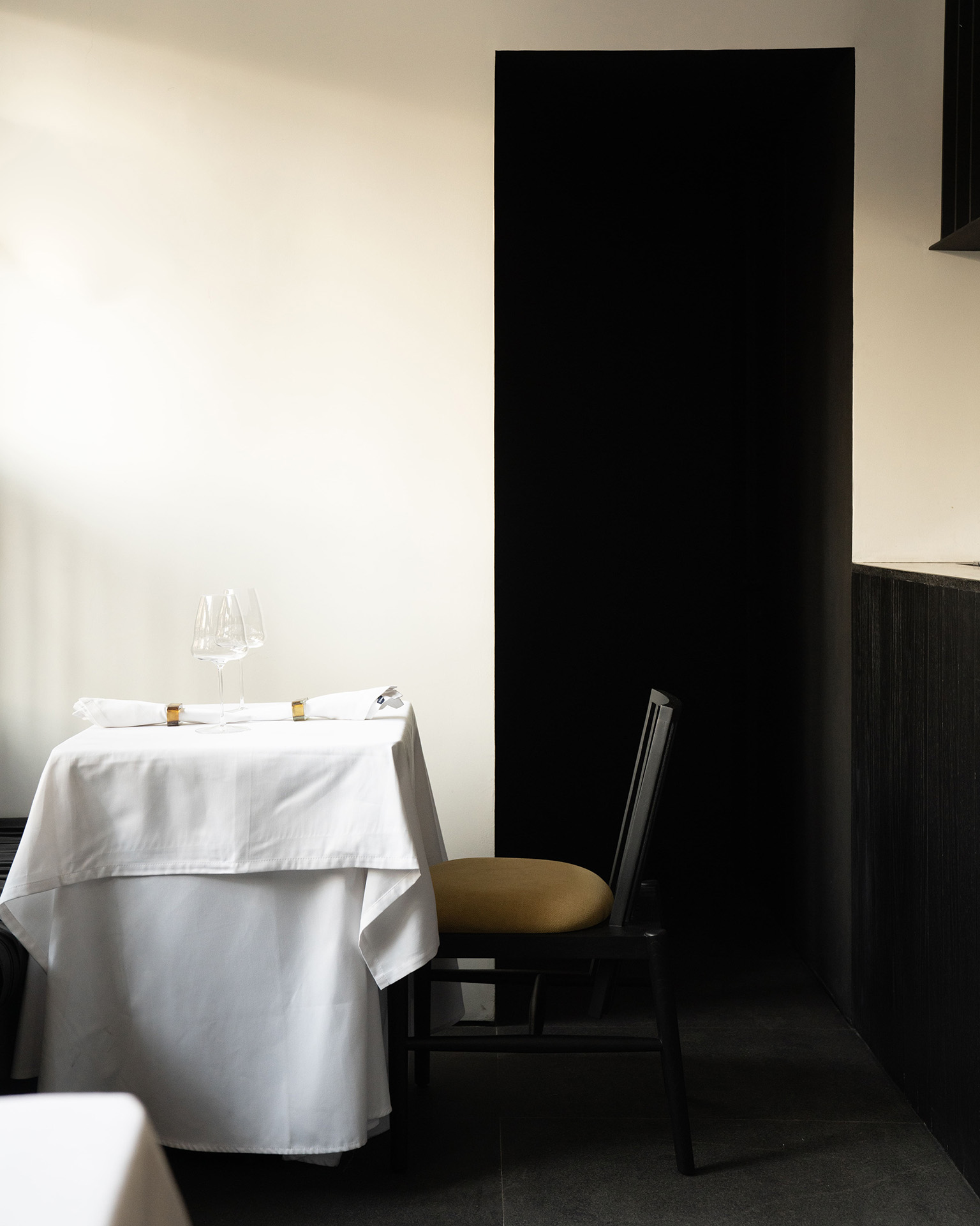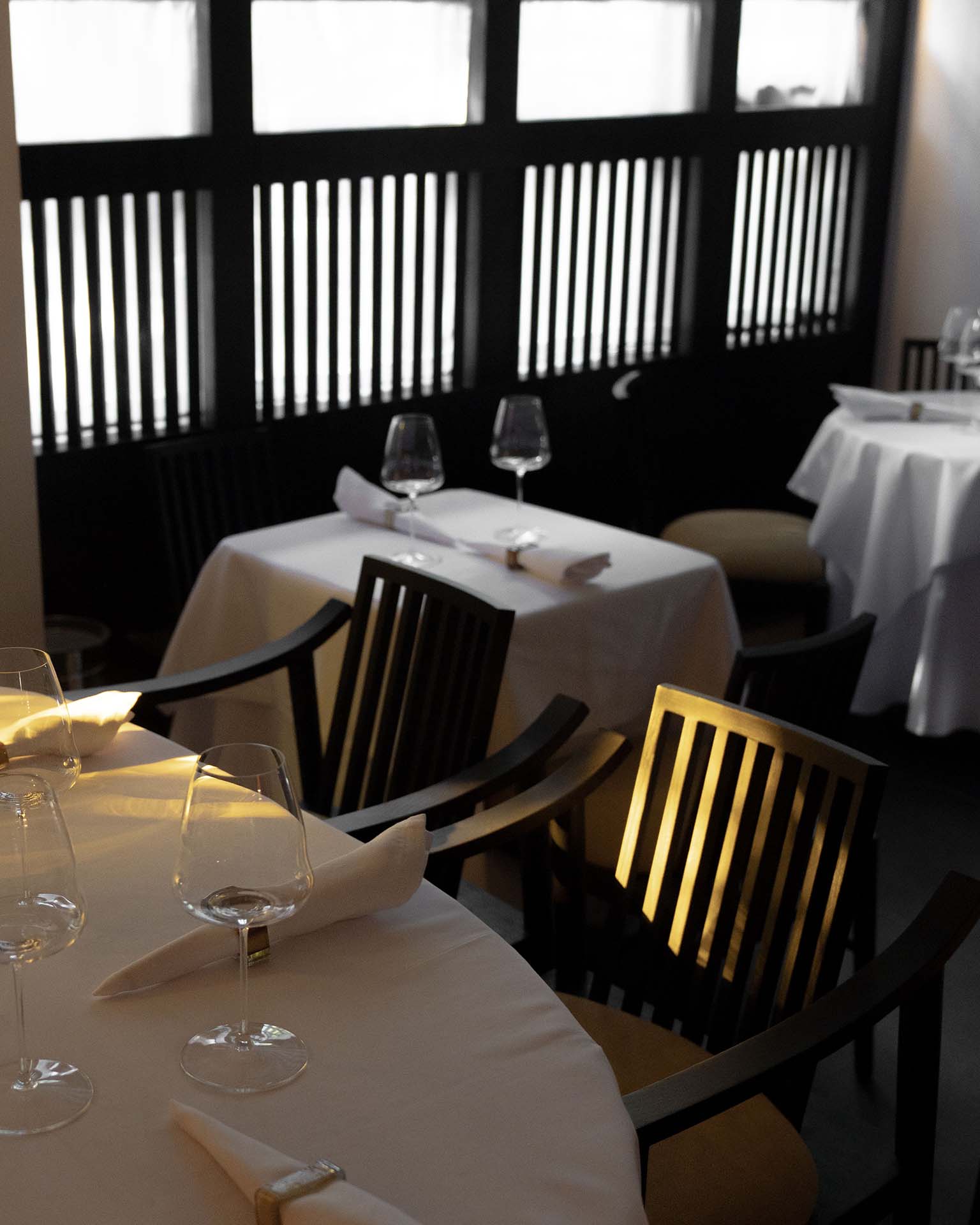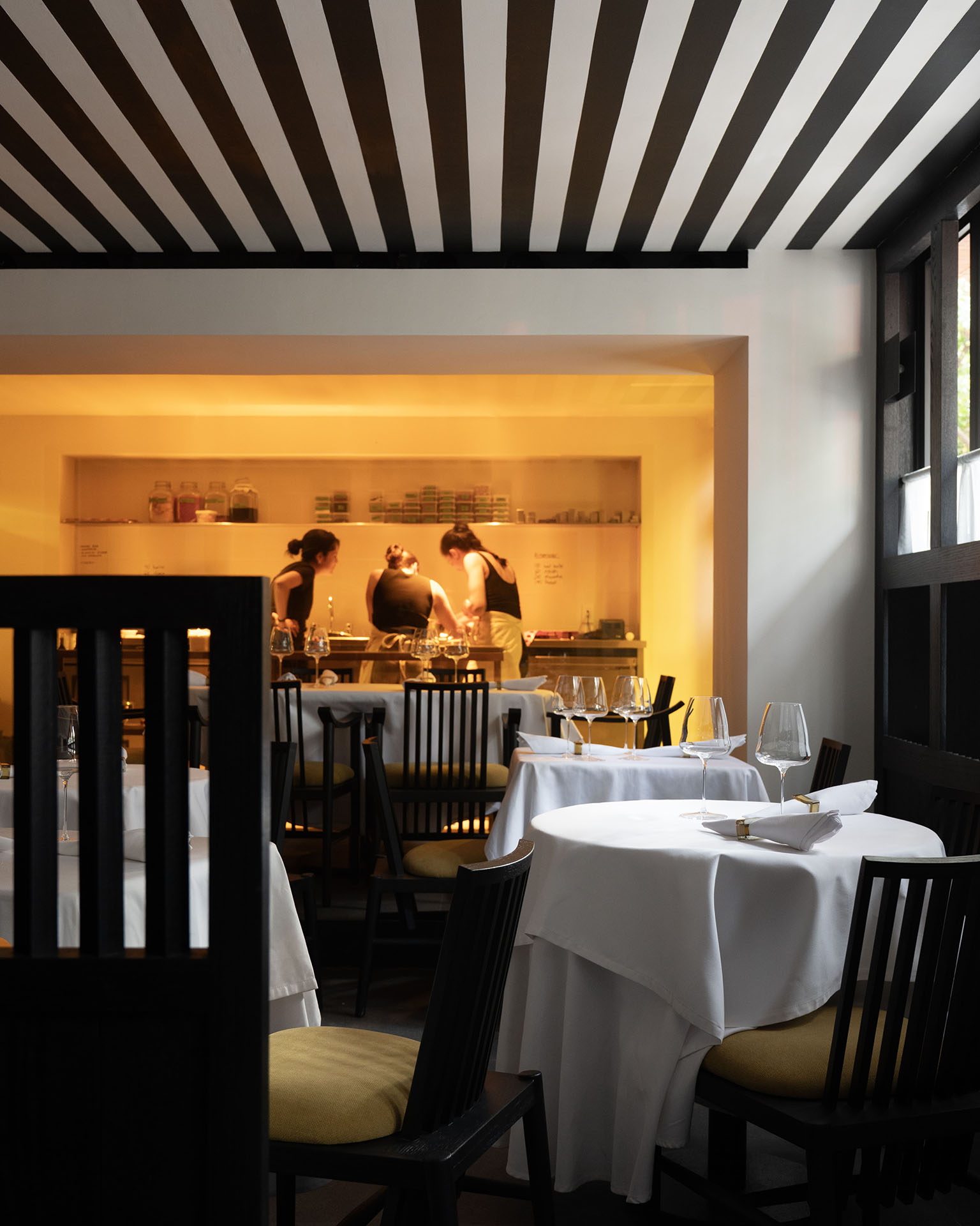 Los techos y muebles cuentan con elegantes líneas en blanco y negro, creando efectos distintivos de sombra y luz que contribuyen a la atmósfera sofisticada del restaurante, que envuelve y celebra tanto el sabor como el diseño.