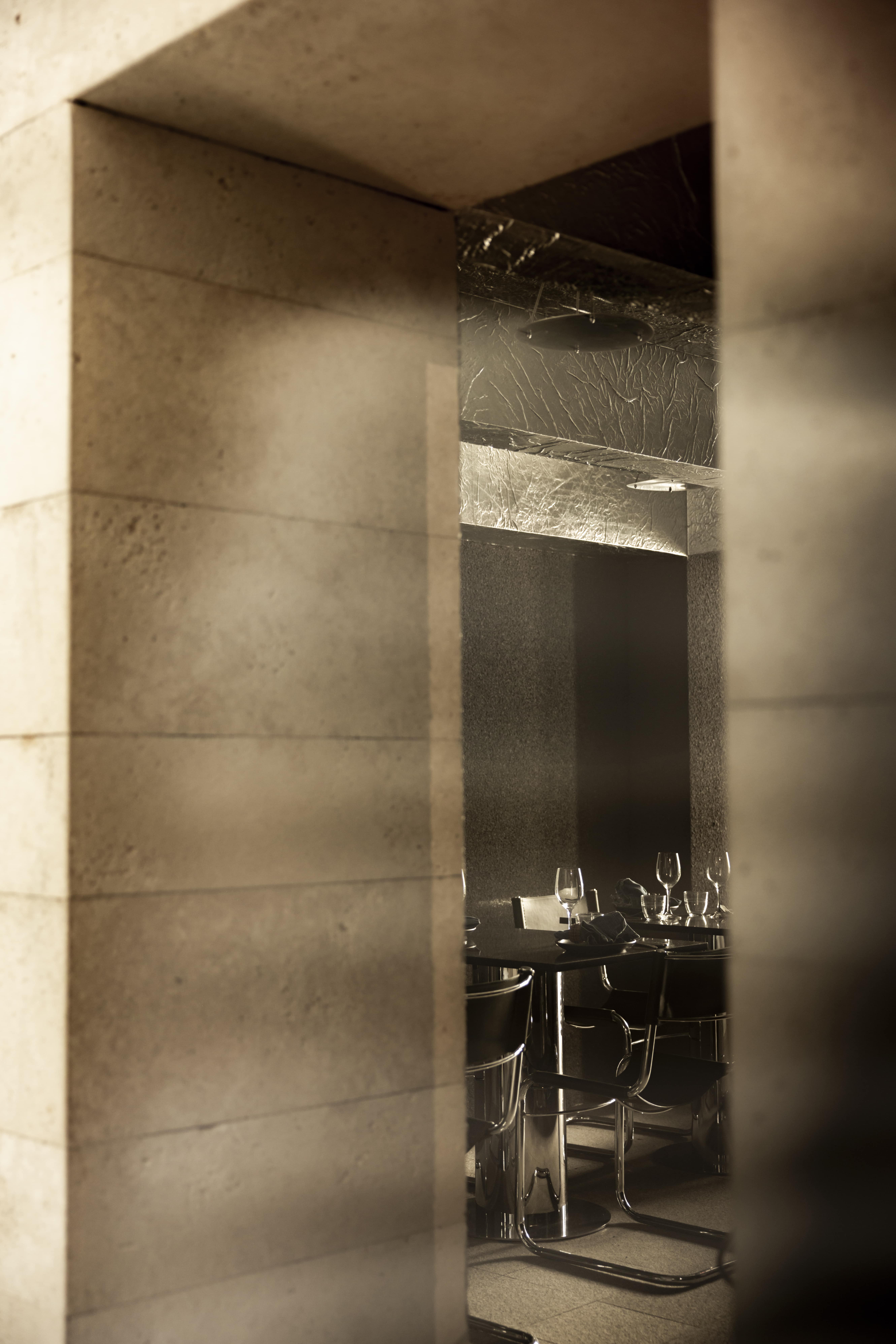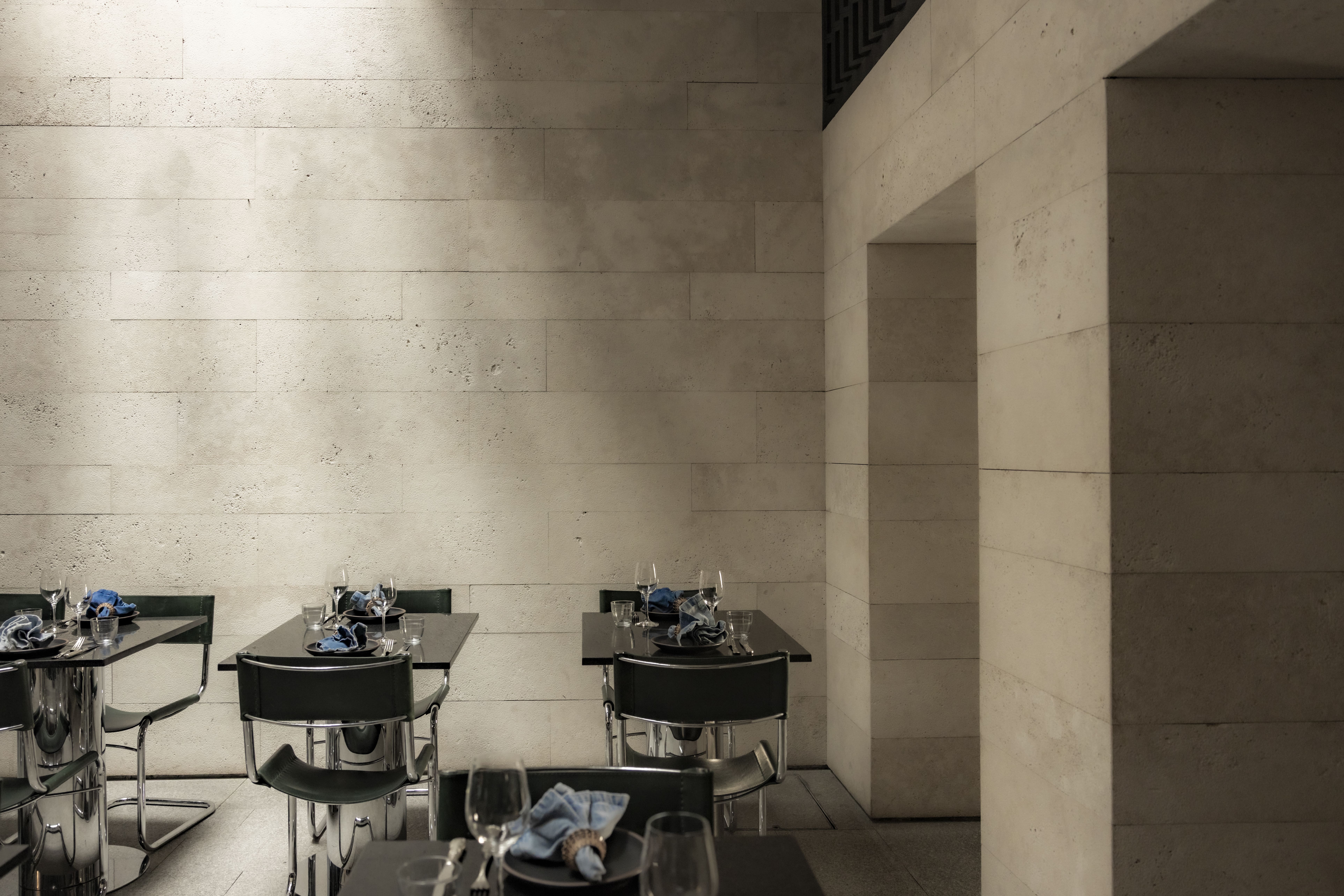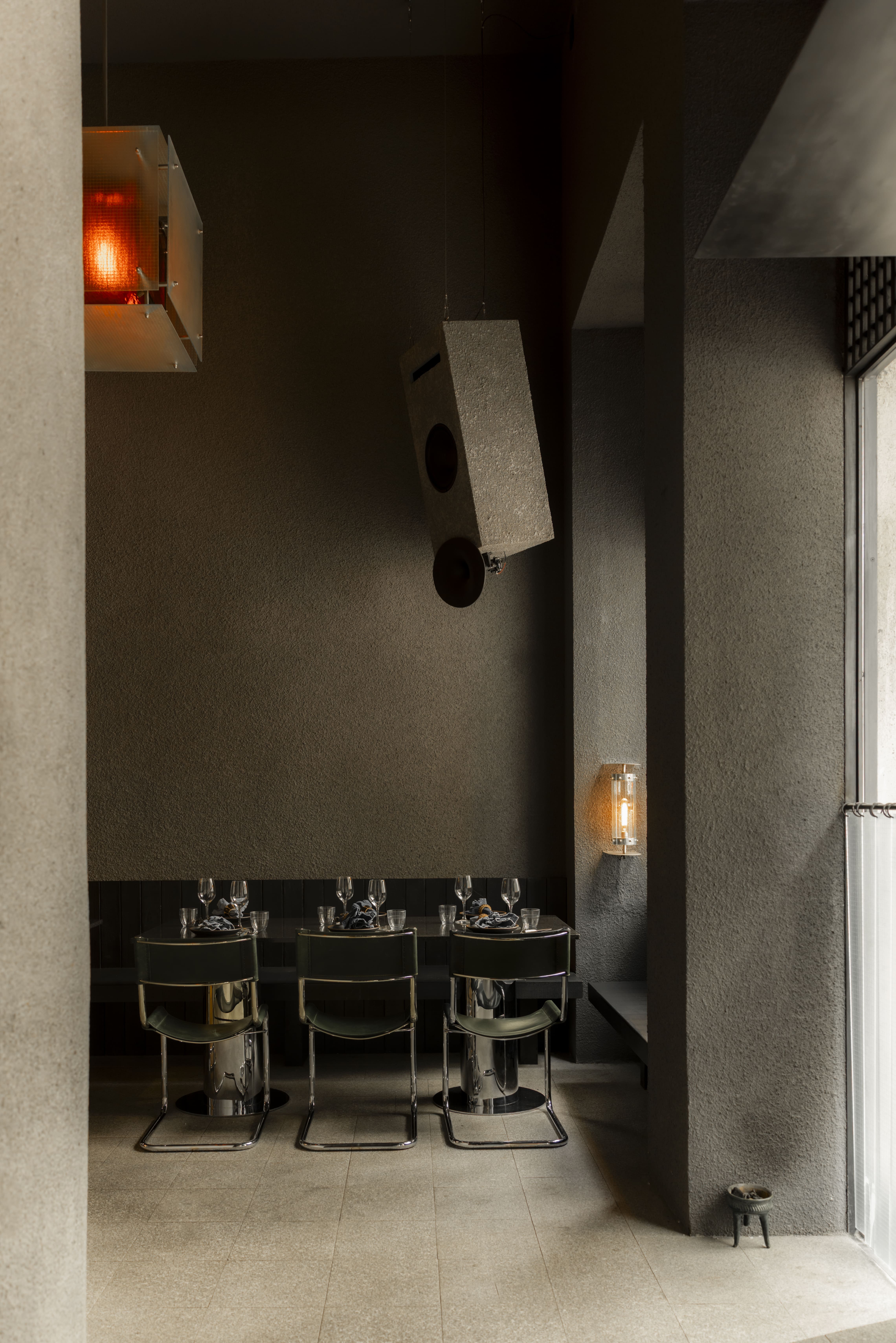 El diseño del restaurante fusiona distintos materiales, definiendo así los diversos espacios y atmósferas que componen el proyecto. Desde la calle Artículo 123, se accede por un exterior sobrio, compuesto por madera quemada, una cortina de vidrio y una celosía superior que filtra la luz hacia el interior. Al ingresar, te recibe una estructura escultórica de concreto martelinado que contiene una escalera que conecta al espacio para reservaciones privadas; esta escalera, además de tener una función circulatoria, delimita el vestíbulo y el primer espacio destinado para comensales.