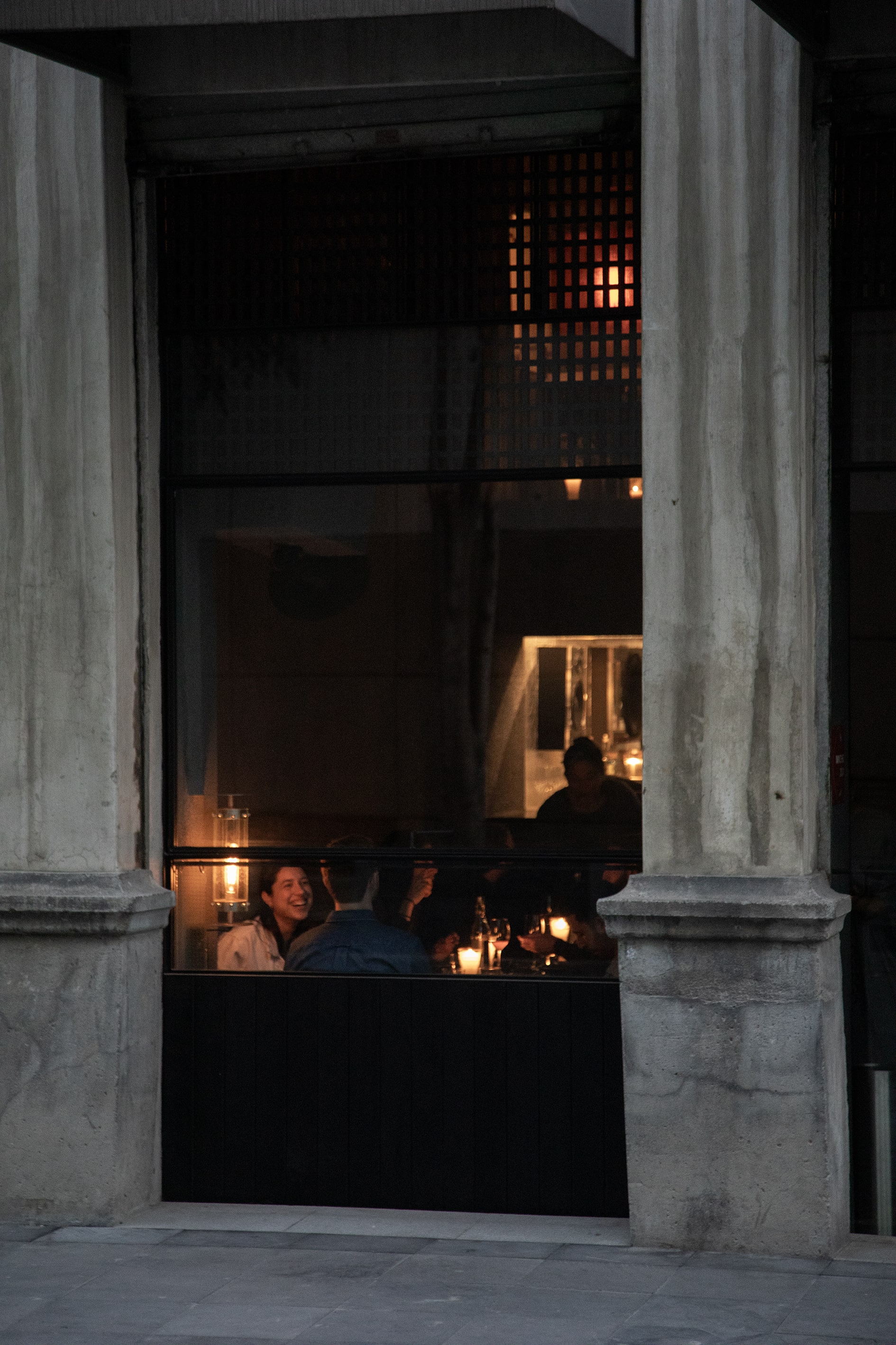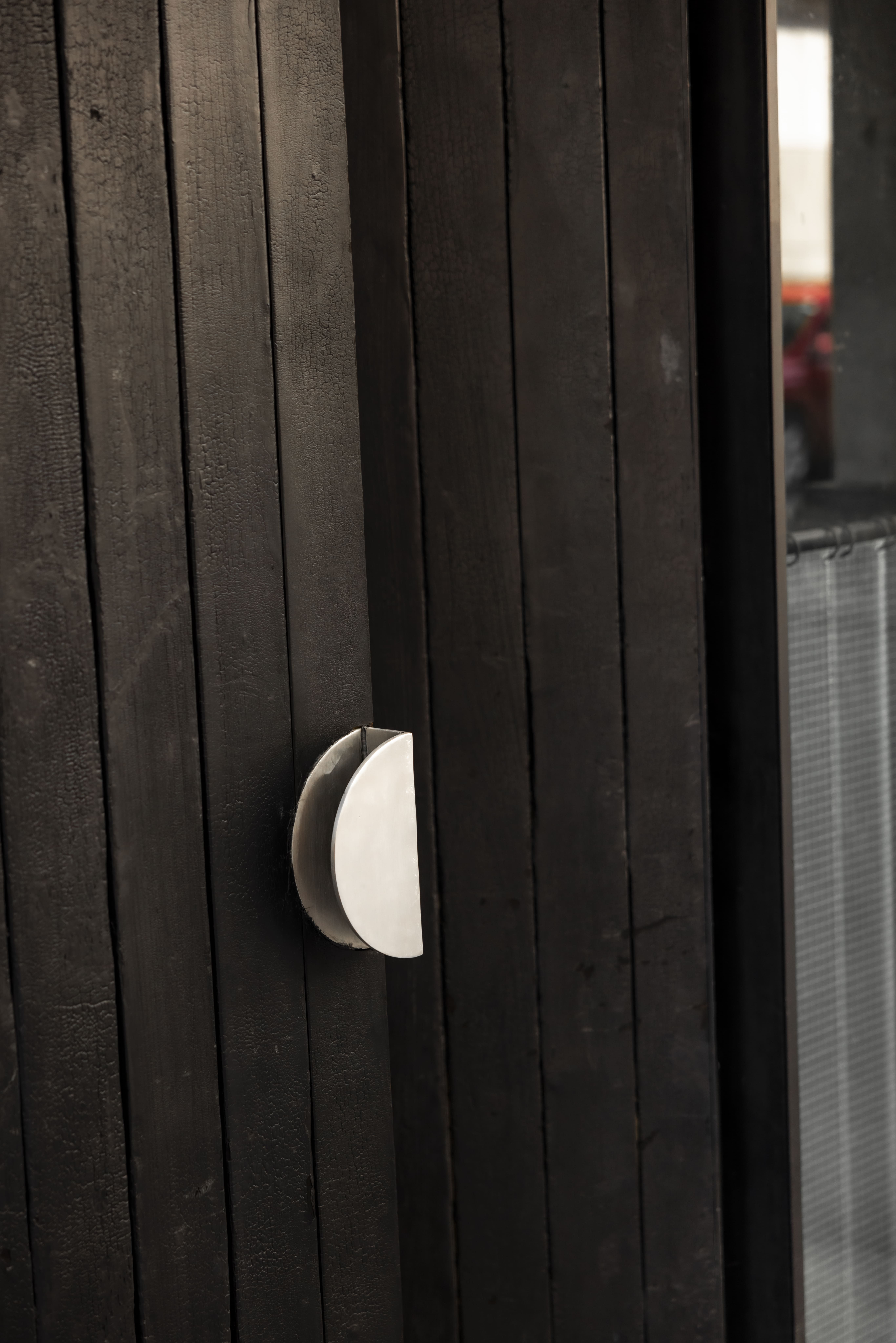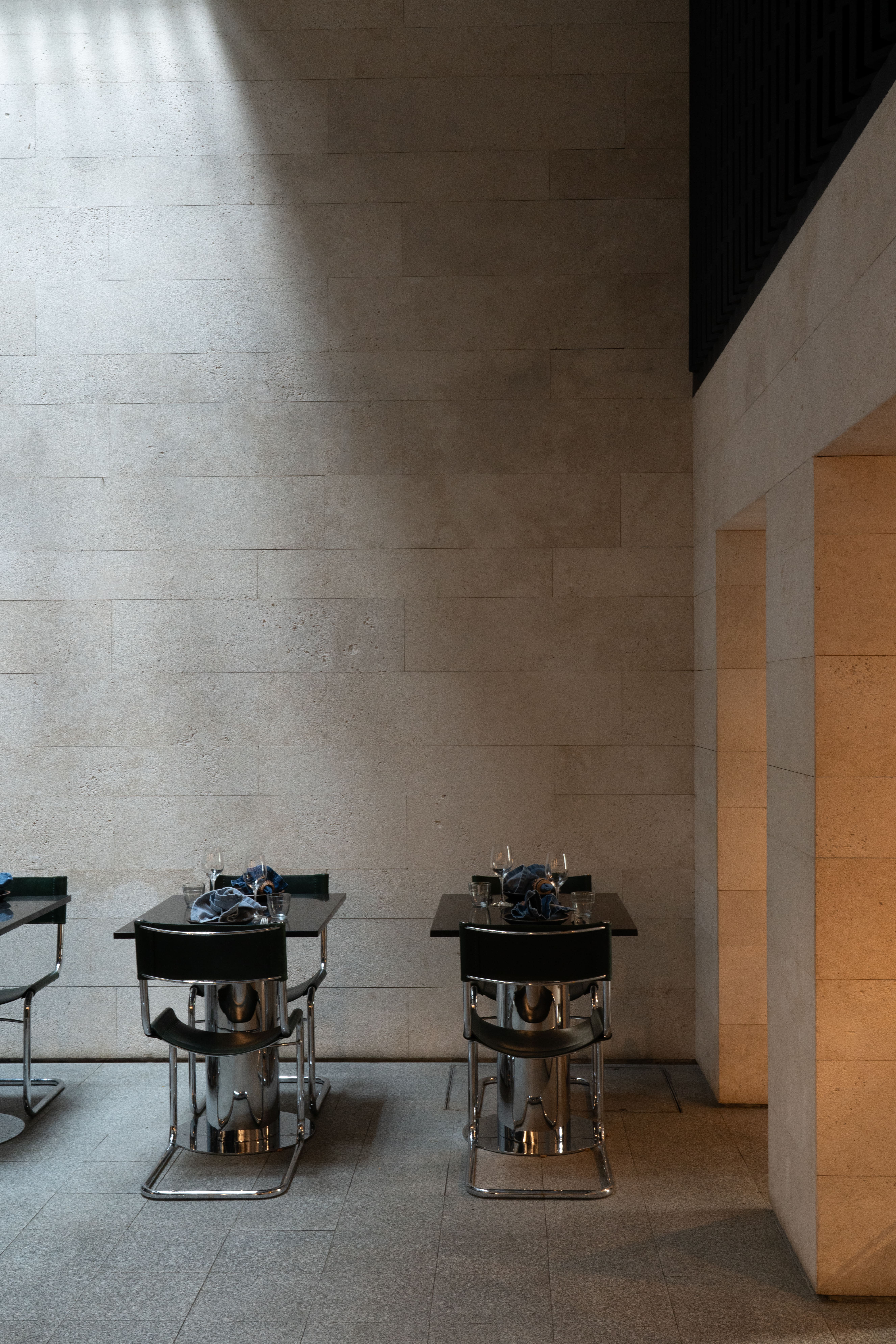 El diseño del restaurante fusiona distintos materiales, definiendo así los diversos espacios y atmósferas que componen el proyecto. Desde la calle Artículo 123, se accede por un exterior sobrio, compuesto por madera quemada, una cortina de vidrio y una celosía superior que filtra la luz hacia el interior. Al ingresar, te recibe una estructura escultórica de concreto martelinado que contiene una escalera que conecta al espacio para reservaciones privadas; esta escalera, además de tener una función circulatoria, delimita el vestíbulo y el primer espacio destinado para comensales.