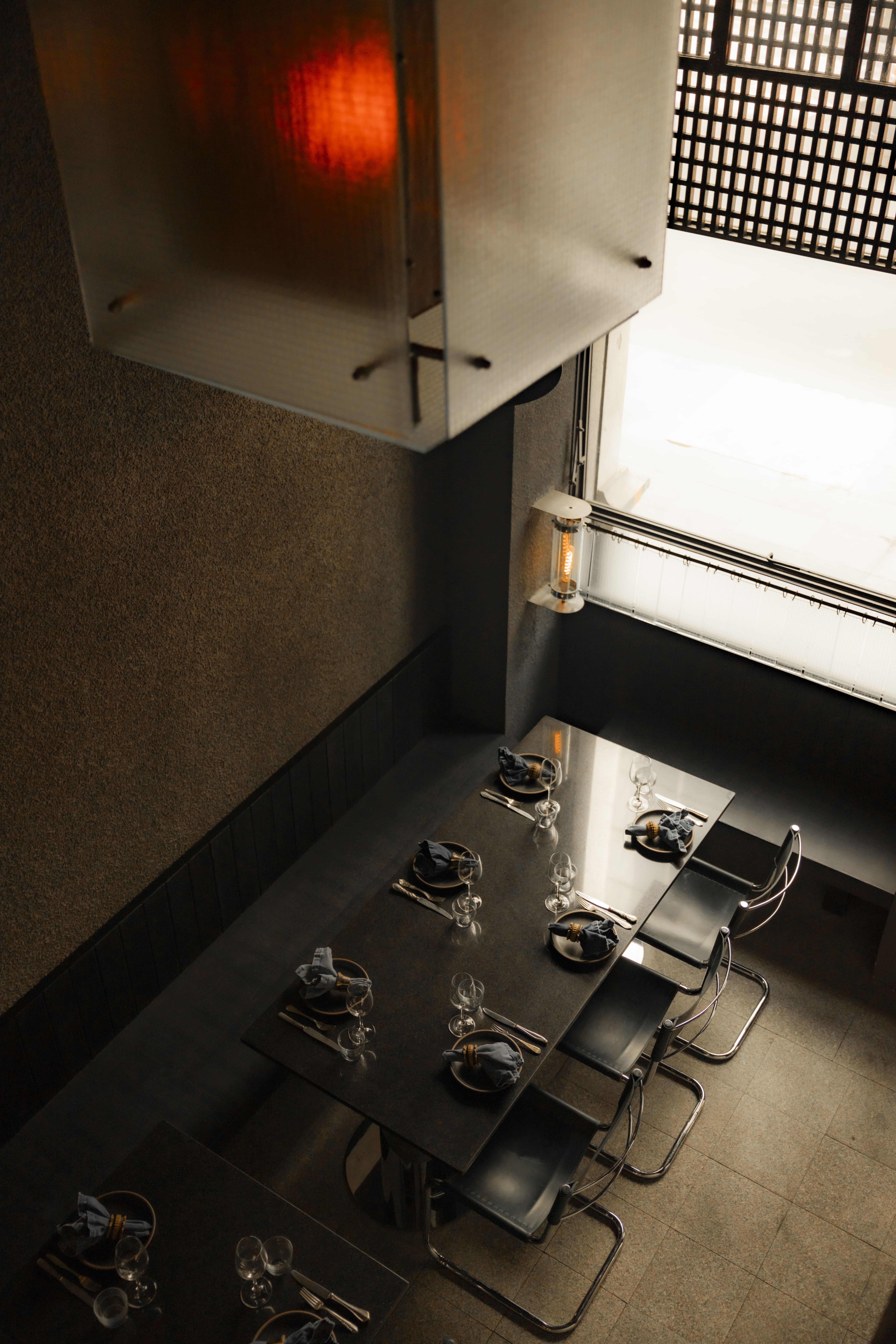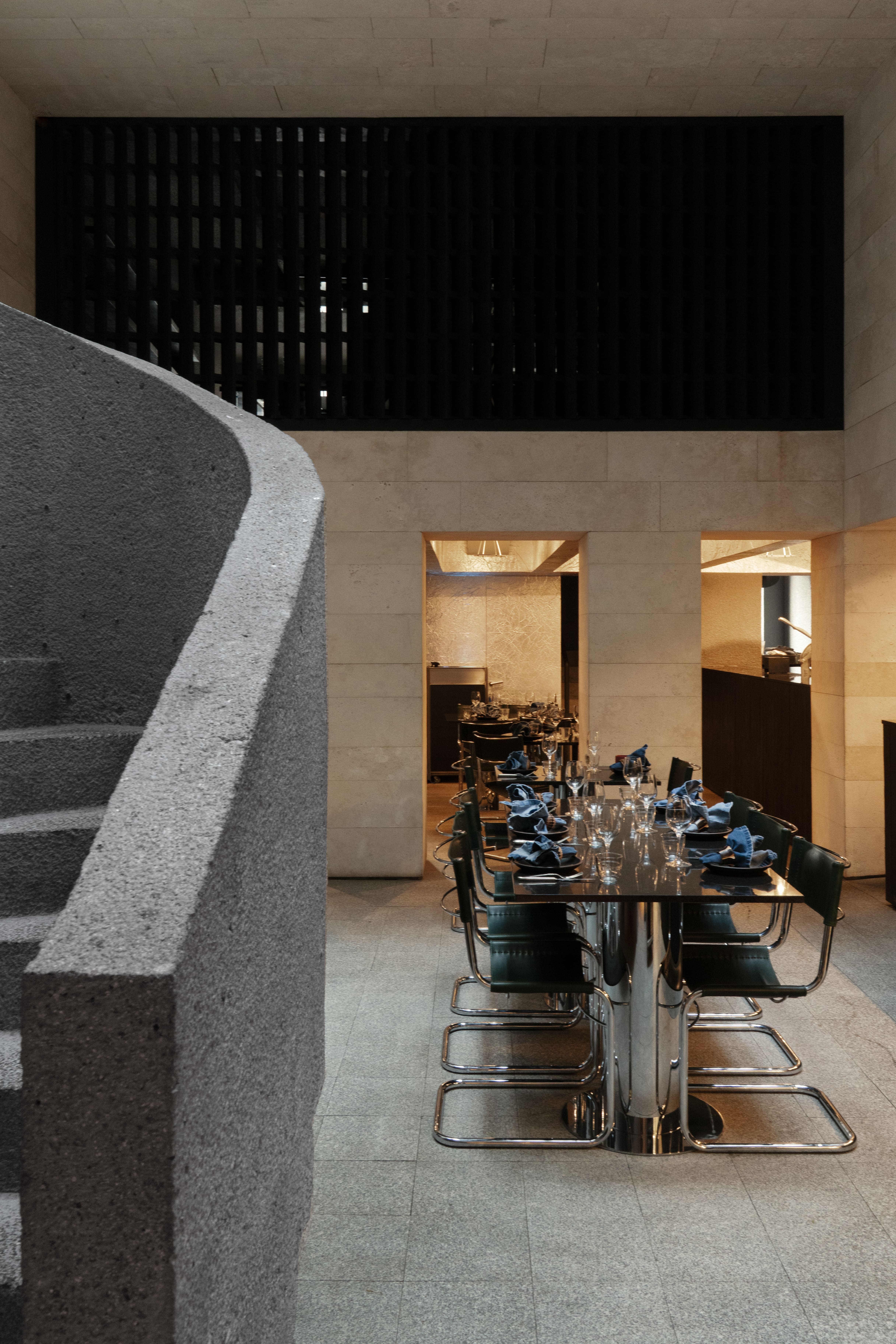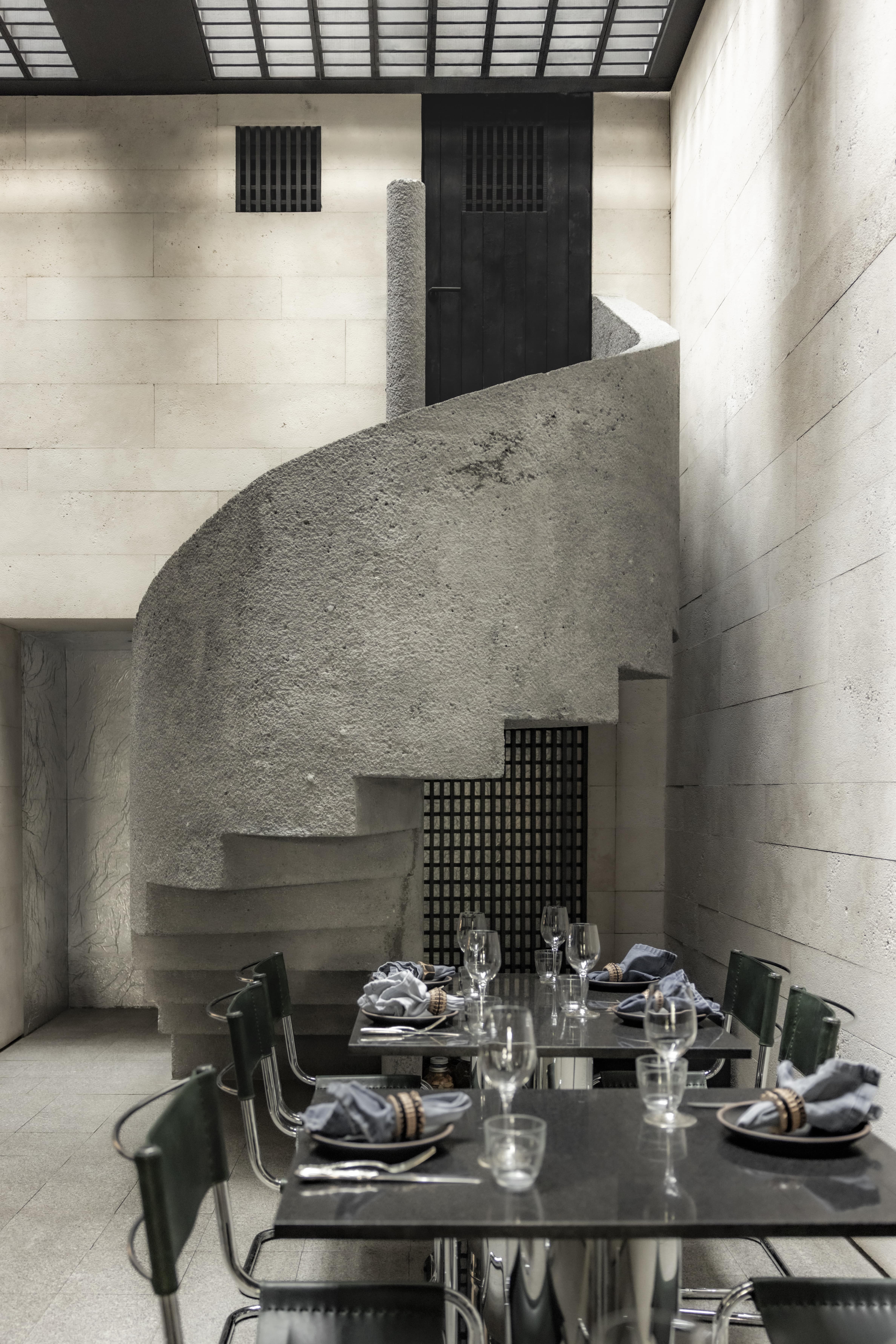 La escalera curva conduce a un espacio privado, desde el cual es posible apreciar la estructura original del edificio, dejada al descubierto por razones tanto estéticas como funcionales. En este espacio se vuelve a utilizar una celosía, que no solo permite filtrar la luz sino también ventilar el ambiente. Este fue concebido como el lugar más íntimo del restaurante.