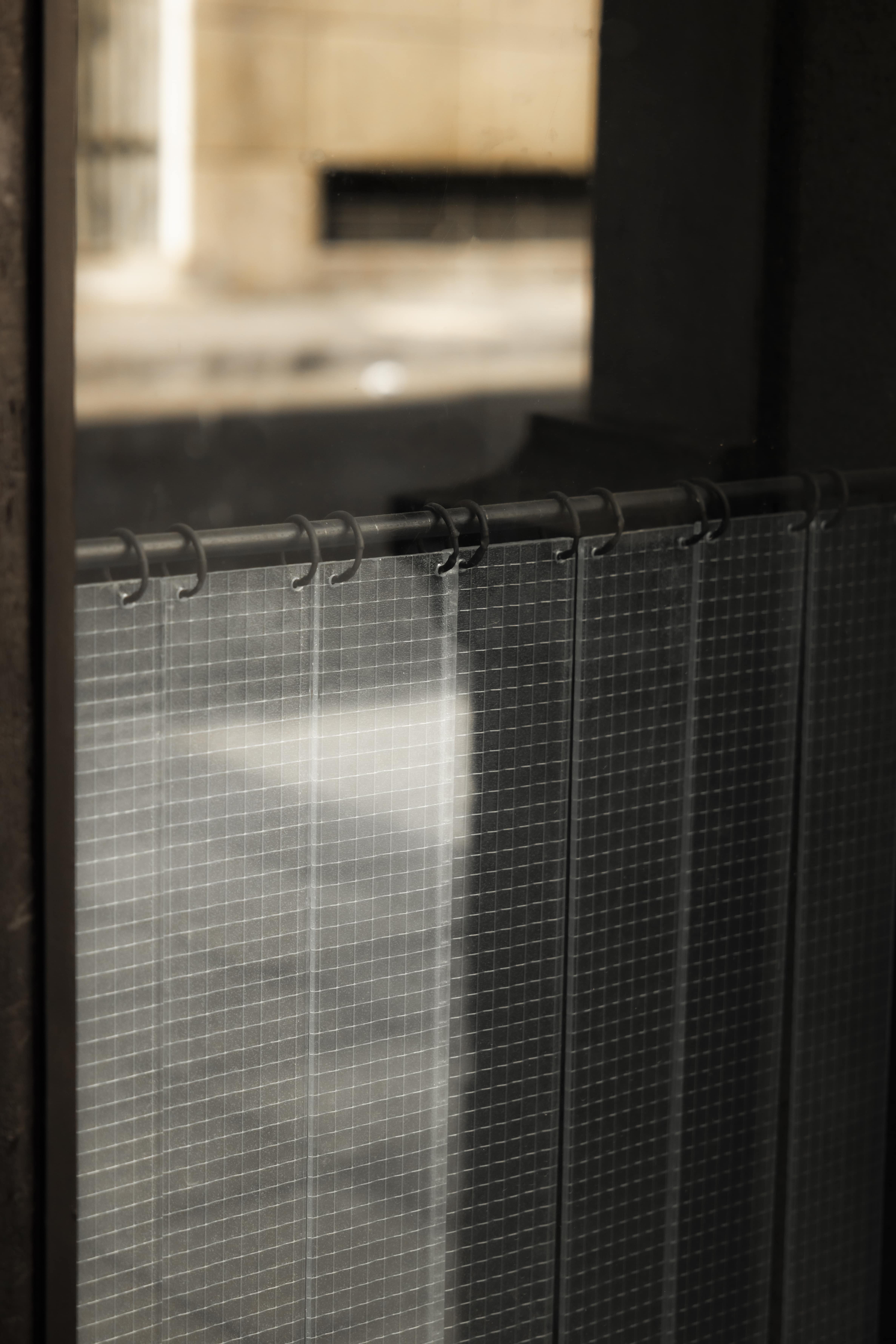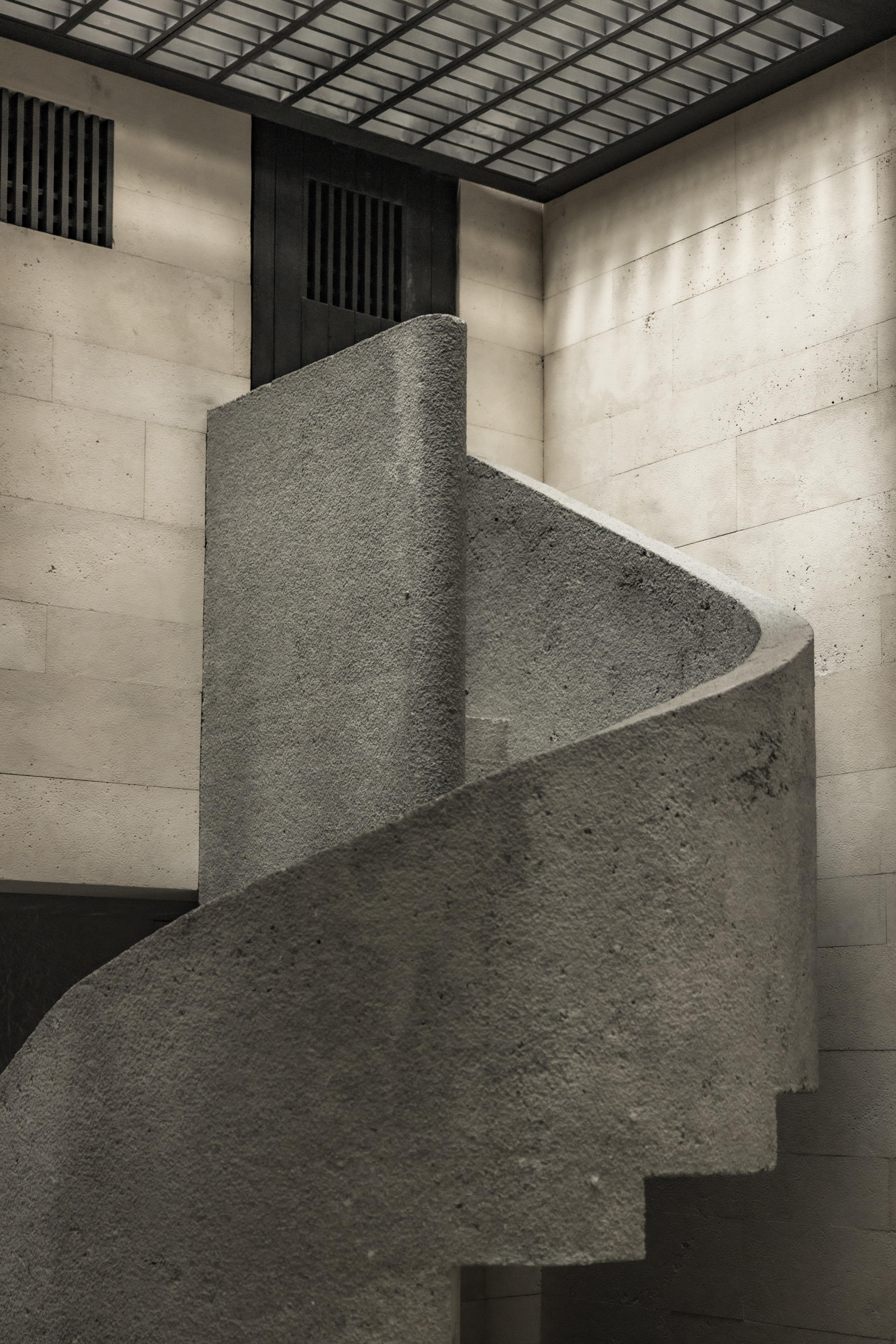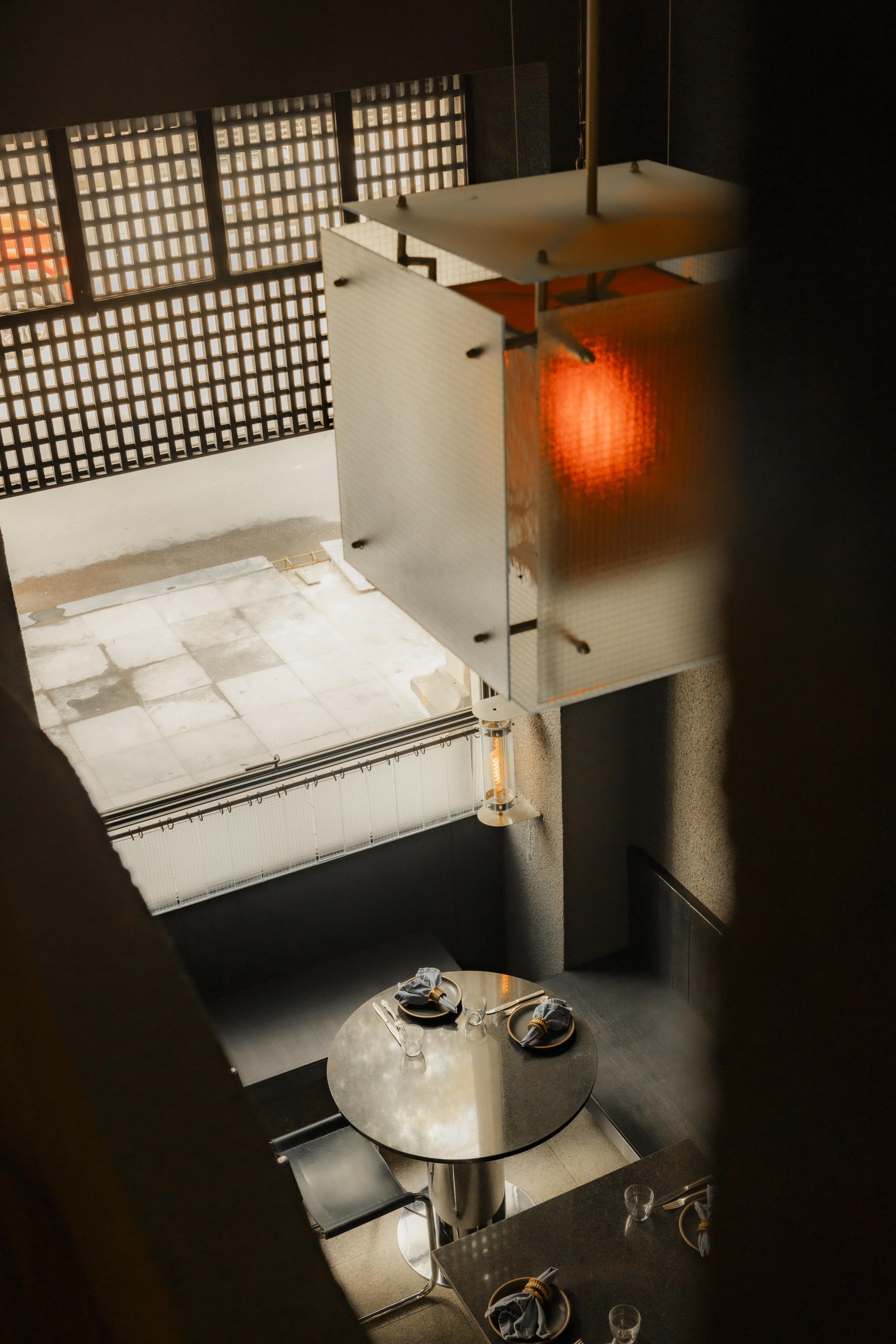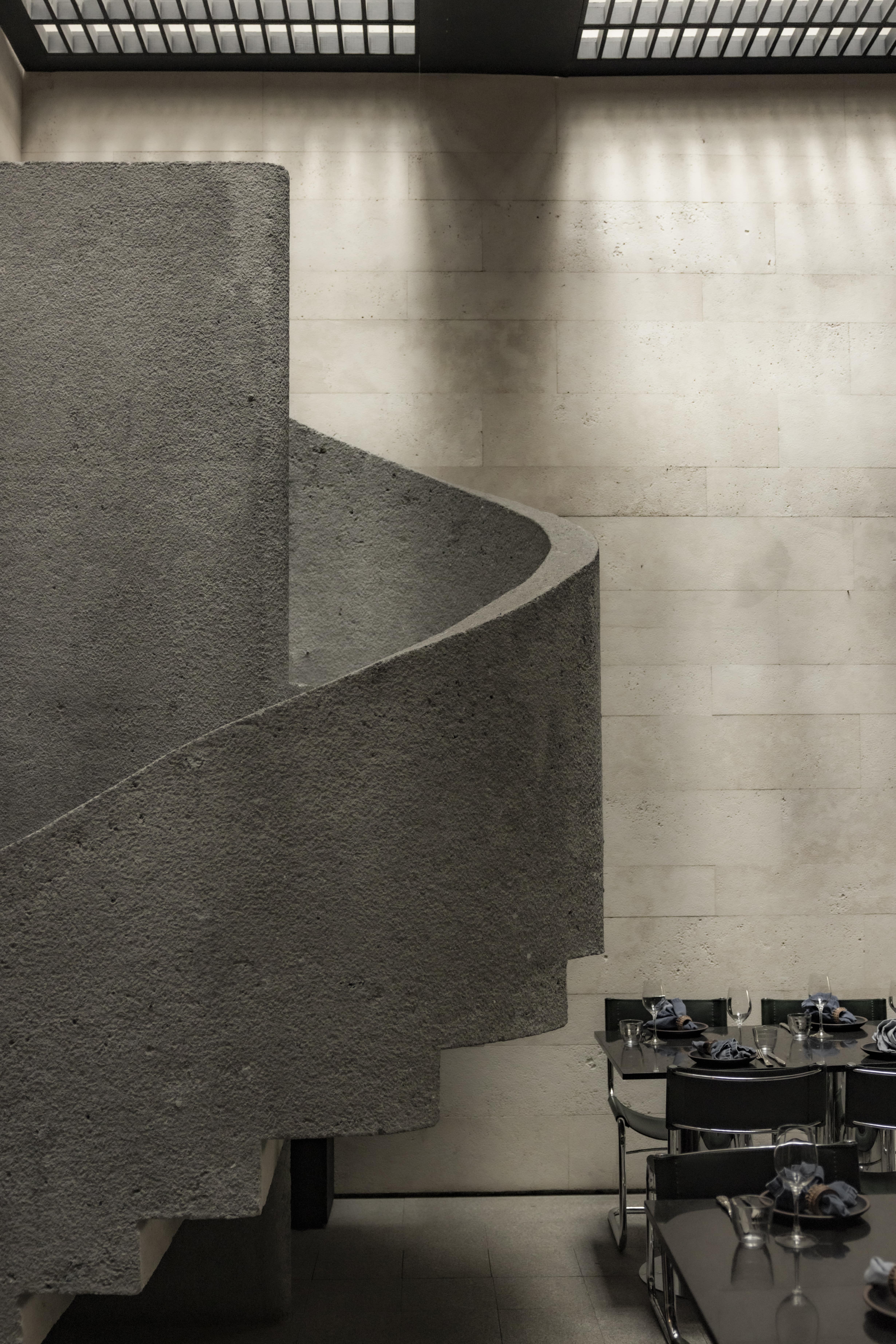 La escalera curva conduce a un espacio privado, desde el cual es posible apreciar la estructura original del edificio, dejada al descubierto por razones tanto estéticas como funcionales. En este espacio se vuelve a utilizar una celosía, que no solo permite filtrar la luz sino también ventilar el ambiente. Este fue concebido como el lugar más íntimo del restaurante.