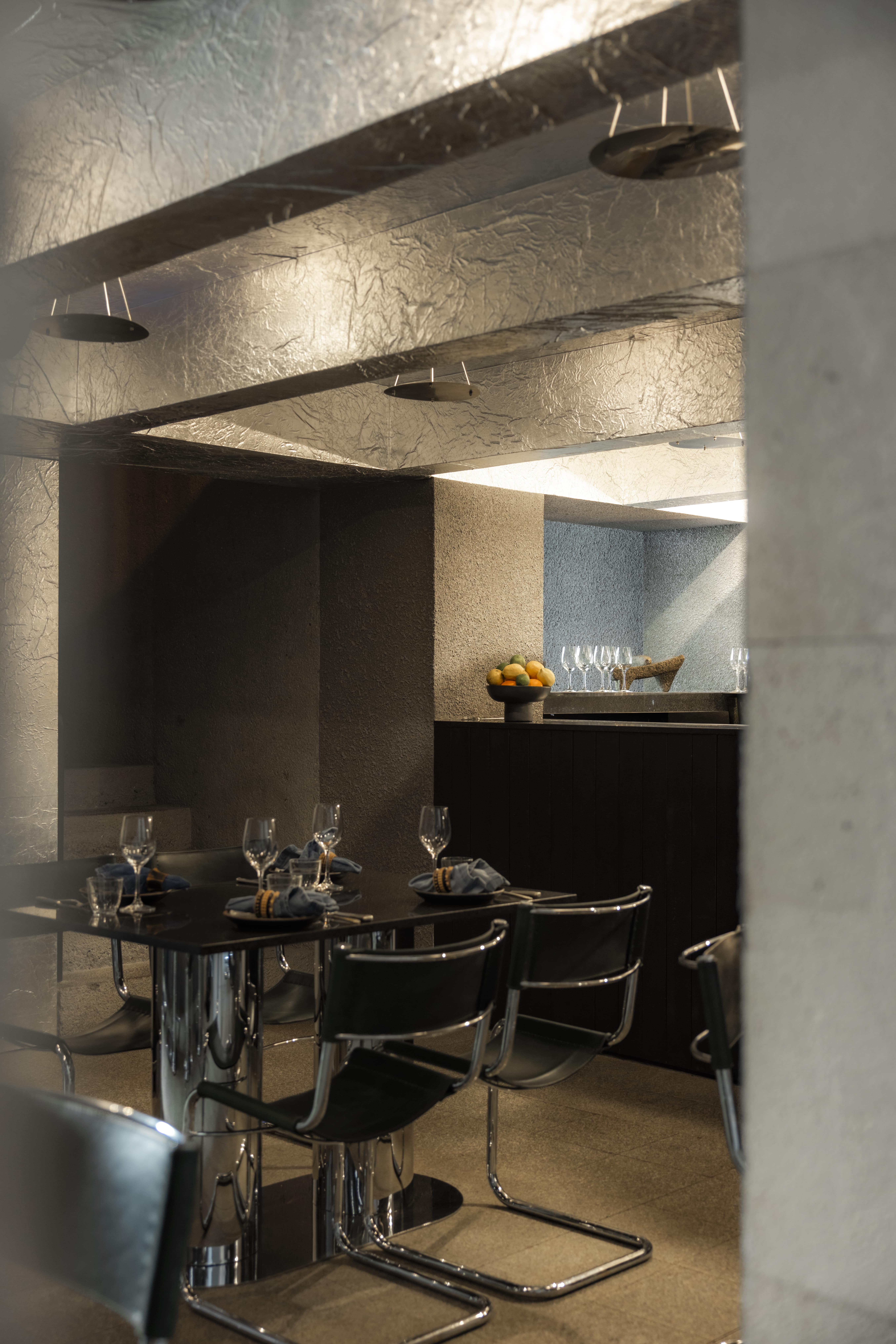 Debajo del privado se encuentra el bar, el espacio de menor altura. Debido a esta condición, y con el fin de aprovechar al máximo la luz artificial, se optó por cubrir el plafón con una tela metalizada que evoca a La Fábrica (1963-1987) de Andy Warhol. Este material refleja la luz de las lámparas, generando un juego de sombras que acentúa la textura de los muros. Es el único espacio sin iluminación natural.