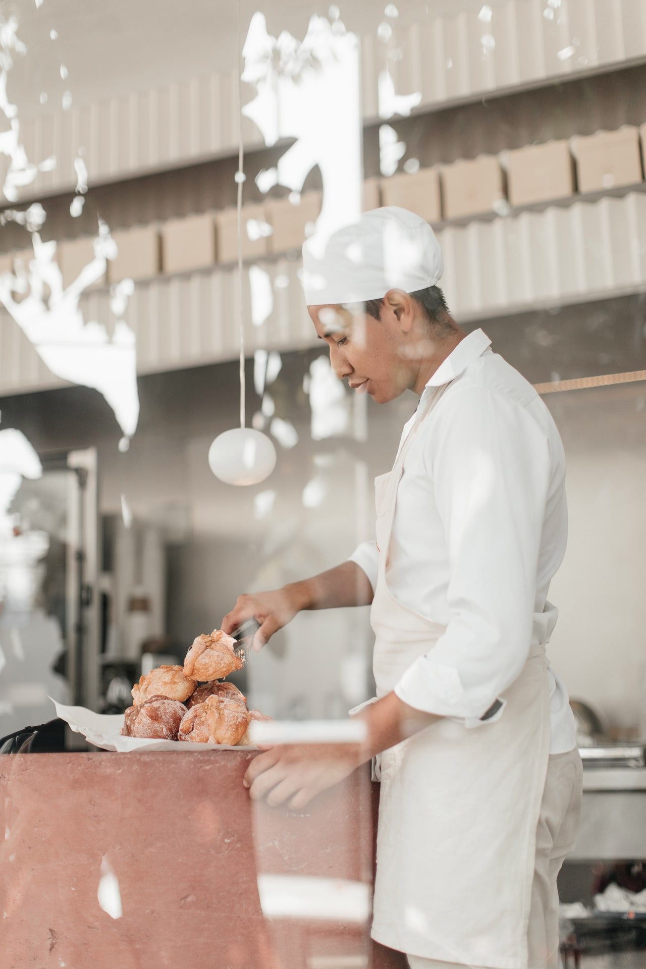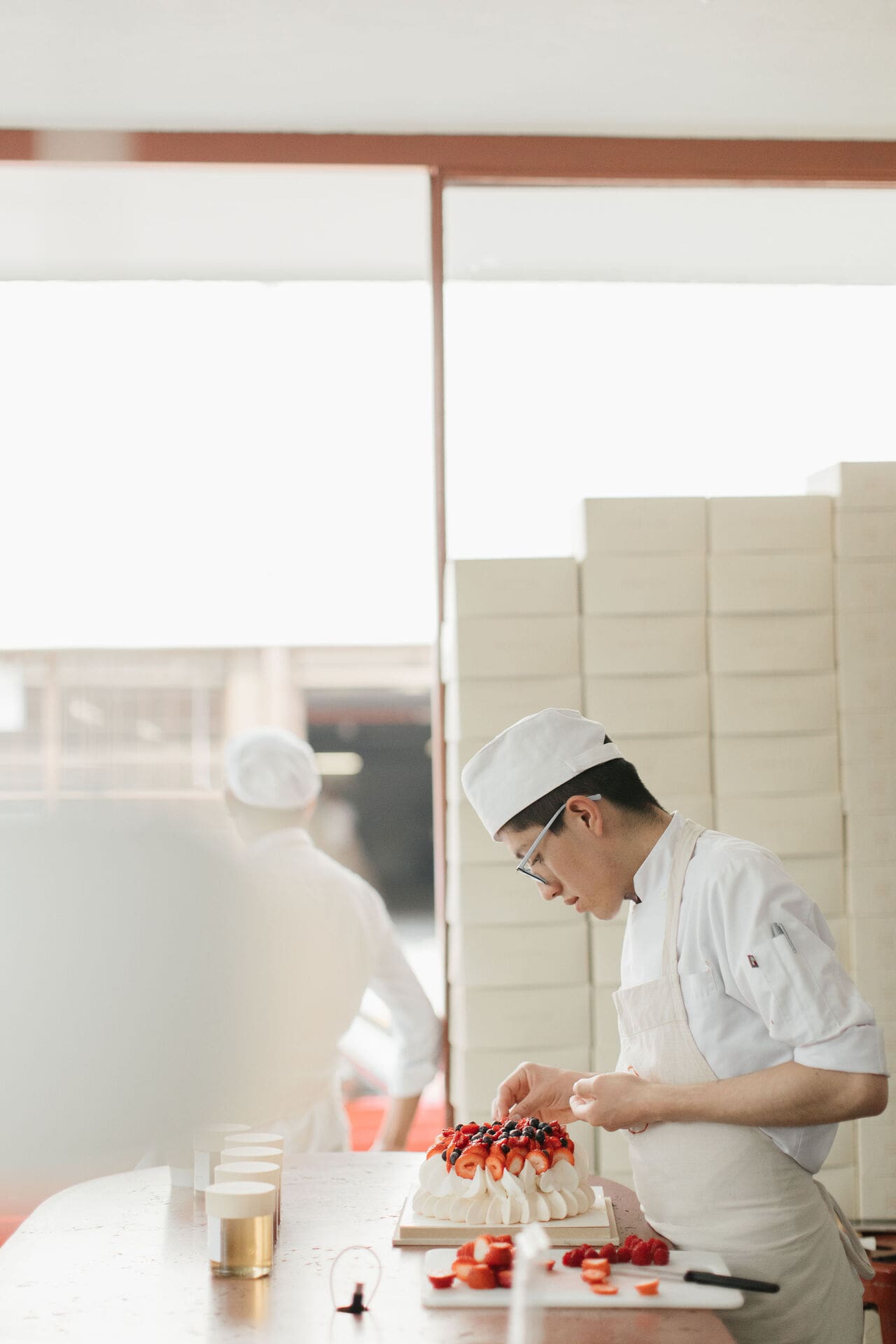 El interior es de un color neutro, e integra unos toques de color terracota que unifican el diseño de forma muy sutil y dan un toque de calidez. La pared texturizada, que enmarca la cocina, permite el continuo juego de luces y sombras a través del paso del tiempo. Todos los conceptos utilizados en el proyecto fueron guiados por el programa y el diseño, enfatizando no solo las cualidades espaciales de la tienda sino también la importancia del producto final y su proceso de creación.