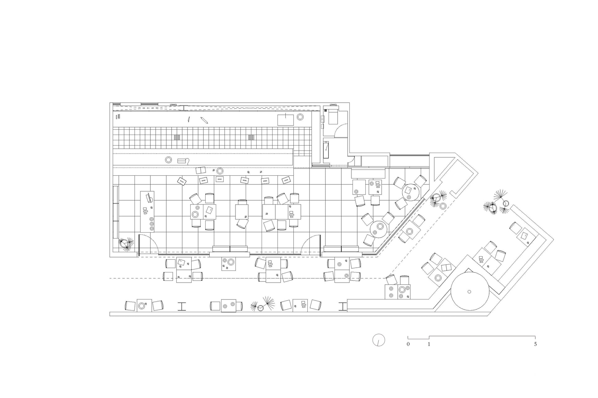 El proyecto arquitectónico propone una distribución espacial eficiente definida por las aperturas de un solo muro. Este muro habitable contiene los servicios y permite la interacción entre la cocina, los servicios y el restaurante. Este elemento enfatiza la horizontalidad - un concepto recurrente en los restaurantes de Enrique Olvera - a través de paneles de madera que van del suelo al techo por una longitud de 11 metros. La modulación de estos paneles y sus vanos no sólo delimitan los distintos programas, sino que también dan sentido y orden al espacio. El muro funciona también como una barra de servicio, ya sea para sentarse a comer, almacenar productos o entregar platillos.