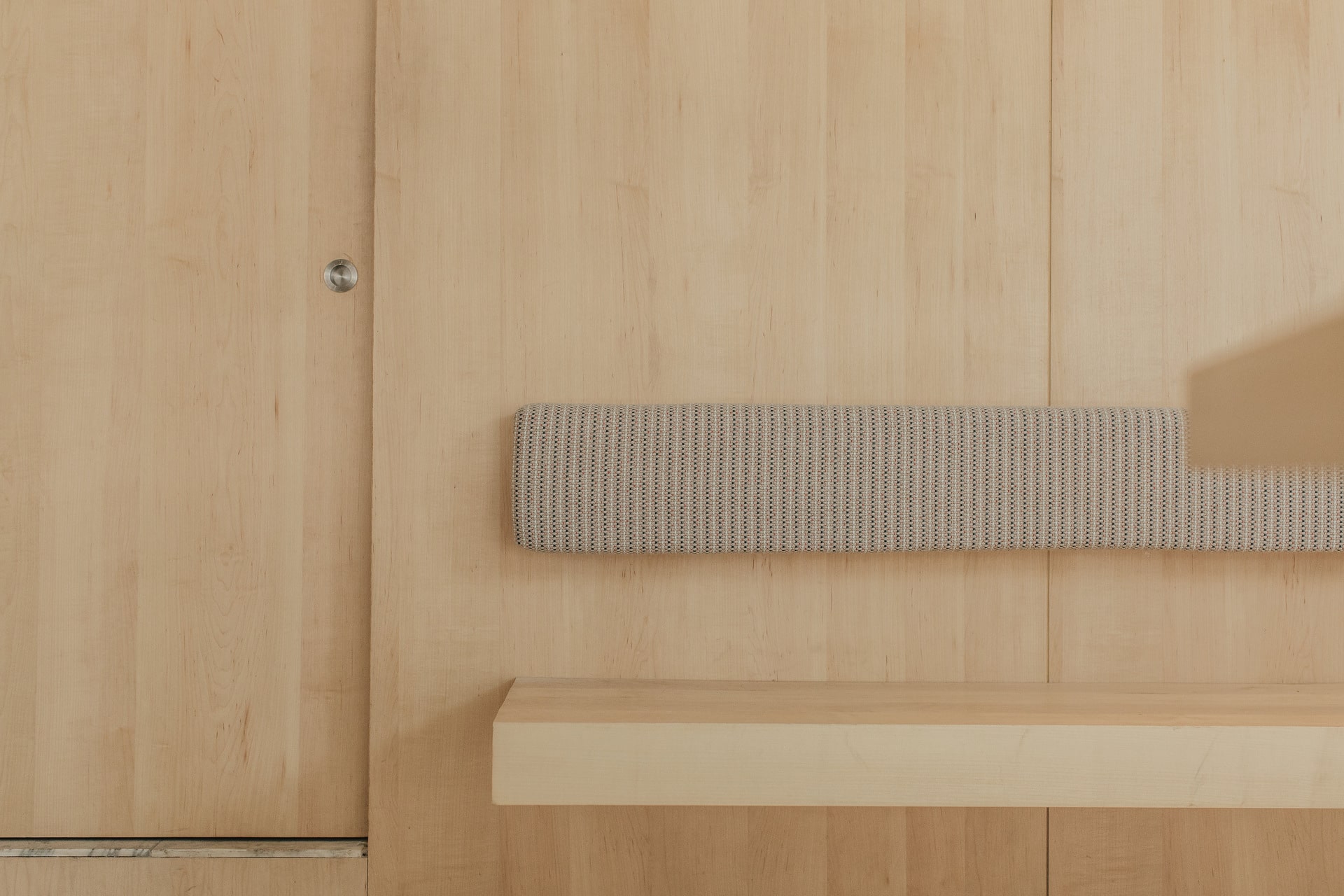 Se utiliza una paleta natural en todo el espacio, con énfasis en el uso de materiales locales. El mármol existente del piso se rescató, y se utilizó madera de arce para las paredes y los muebles. Esta combinación amplifica la sensación de luz y crea un ambiente cómodo y agradable para los clientes. El concreto pigmentado de color rojo quemado juega un papel de contraste con el interior que se define por colores neutros y claros. A pesar de la renovación completa del interior, el diseño remarca las largas líneas horizontales del espacio, al mismo tiempo, agrega calidez y textura que hacen un guiño a la rica historia de materiales de México.